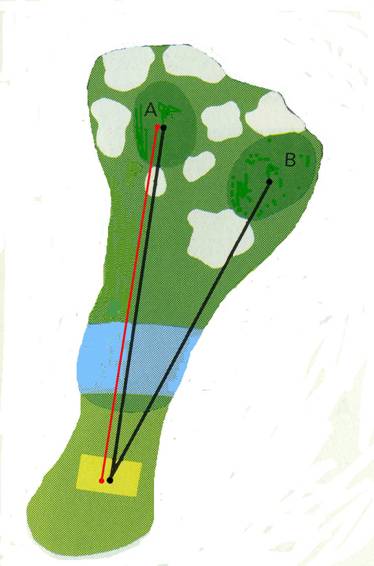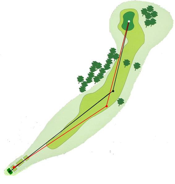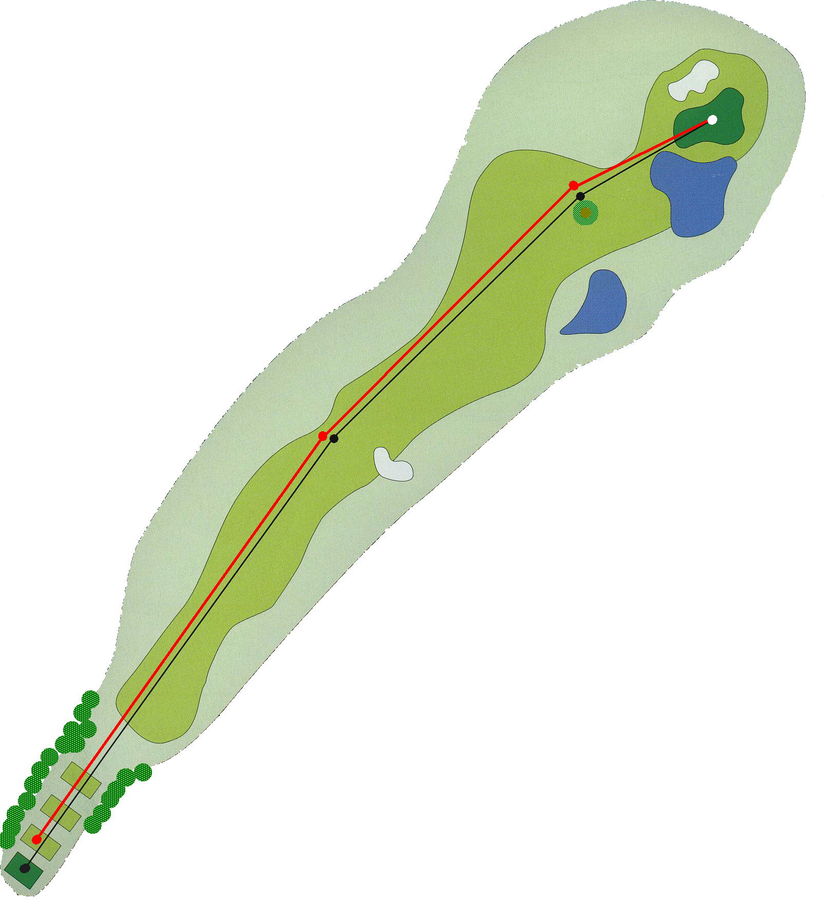 ティーグラウンドに立ちます。トーナメントティーで459ヤード、バックティーで444ヤードと距離のあるパー4です。左ドックレッグで打ち下ろし、フェアウエイバンカーが260ヤード近辺にあり、グリーン左手前は池、右サイドは崖が迫っています。10年ほど前のジャンボ尾崎でもバンカーをキャリーで越すのはぎりぎりでした。現在はバンカーを越えて残り100ヤード足らずに付けるプロはいます。 我々でも打ち下ろしのため300ヤードを越えて飛ばすことが出来ます。すると残りは150ヤードを切っていますので2オンは可能となります。しかし、ちょうどその辺は左下がりのライになり、グリーンに向かって打ち上げで、左は池、右はグリーン側まで崖が迫り、なかなかプレッシャーのある場面であります。ティーショットで230ヤードの平らなところにおいて狙うと、残り200ヤードを越えるショットになり、「月いちゴルファー」の私たちには確率が悪い状態になります。 ◆ところが、230ヤードに置いて、2オンを狙わず刻んでグリーン手前80ヤード近辺に打つことはかなり容易で、そこから3オンを狙うこともかなり容易となります。3オンを覚悟すれば、「月いちゴルファー」でも、ストレスとはならず楽しめるレベルになるのです。かといって、一つ間違えれば難しくなりますので、ハンディなりに楽しめるのです。 トーナメントプロの真似をして、我々「月いちゴルファー」が冒険といえる攻め方をしても、たいへん楽しめますし、3オンねらいでスコアを大事にするのも、たいへん楽しいホールであります。 |
